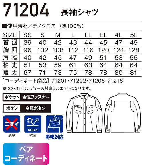 コーディネート商品(※下記画像をクリックすると各商品にジャンプします) 71200 長袖ジャンパー 71204 長袖シャツ 71201 ノータックパンツ 71202 ノータックカーゴパンツ 71206 レディースパンツ 71216 レディースカーゴパンツ 71200 長袖ジャンパー& 71201 ノータックパンツセット 71200 長袖ジャンパー& 71202 ノータックカーゴパンツセット 71200 長袖ジャンパー& 71206 レディースパンツセット 71200 長袖シャツ& 71216 レディースカーゴパンツ 71204 長袖シャツ& 71201 ノータックパンツ 71204 長袖シャツ& 71202 ノータックカーゴパンツ 71204 長袖シャツ& 1206 レディースパンツ 71204 長袖シャツ& 71216 レディースカーゴパンツ